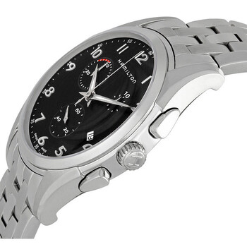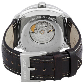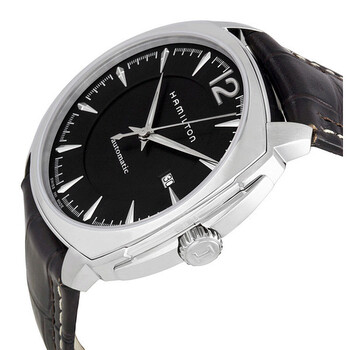 Stainless steel case with a brown croco-embossed leather bracelet with contrast stiching. Fixed stainless steel bezel. Black dial with silver-tone hands and index hour markers. Arabic numeral marks the 12 o'clock position. Minute markers around the outer rim. Date display appears at the 3 o'clock position. Automatic movement. Scratch resistant sapphire crystal. Solid case back. Case diameter: 43 mm. Tang clasp. Water resistant at 100 meters/ 330 feet. Functions: hours, minutes, seconds, date. Hamilton Cushion Black Dial Brown Leather Strap Stainless Steel Men's Watch H36515535.
