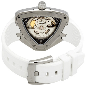 Stainless steel case with a white rubber strap. Fixed stainless steel bezel. White dial with luminous silver-tone hands and index hour markers. Minute markers around the outer rim. Dial Type: Analog. Luminescent hands and markers. Date display at the 3 o'clock position. Hamilton calibre H-10 automatic movement, based upon ETA C07.111, containing 25 Jewels, bitting at 21600 vph, and has a power reserve of approximately 80 hours. Scratch resistant sapphire crystal. Transparent case back. Asymmetric case shape. Case dimensions: 42.5 mm x 44.6 mm. Case thickness: 11.38 mm. Band width: 21 mm / 22 mm. Tang clasp. Water resistant at 50 meters / 165 feet. Functions: date, hour, minute, second. Casual watch style. Watch label: Swiss Made. Hamilton Elvis8 Automatic Shield Shaped Men's Watch H24505311.