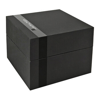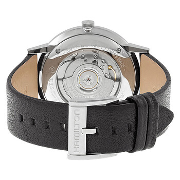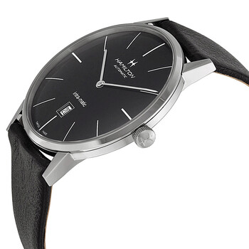 Stainless steel case with a black leather strap. Fixed stainless steel bezel. Black dial with silver-tone hands and index hour markers. Dial Type: Analog. Date display at the 6 o'clock position. ETA caliber 2892-A2 automatic movement, based upon ETA 2890, containing 21 Jewels, bitting at 28800 vph, and has a power reserve of approximately 42 hours. Scratch resistant sapphire crystal. Pull / push crown. Skeleton case back. Round case shape. Case size: 42 mm. Case thickness: 14.25 mm. Band width: 22 mm. Band length: 8.5 inches. Tang clasp. Water resistant at 50 meters / 165 feet. Functions: date, hour, minute, second. Dress watch style. Watch label: Swiss Made. Hamilton Intra-Matic Automatic Black Dial Men's Watch H38755731.