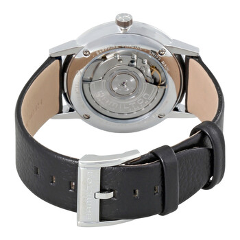 Stainless steel case with a black leather strap. Fixed stainless steel bezel. Black dial with silver-tone hands and index hour markers. Dial Type: Analog. Date display above the 6 o'clock position. ETA caliber 2892-A2 automatic movement, based upon ETA 2890, containing 21 Jewels, bitting at 28800 vph, and has a power reserve of approximately 42 hours. Scratch resistant sapphire crystal. Pull / push crown. Transparent case back. Round case shape. Case size: 38 mm. Case thickness: 10 mm. Band width: 20 mm, band length: 7.5 inches. Tang clasp. Water resistant at 50 meters / 165 feet. Functions: date, hour, minute. Casual watch style. Watch label: Swiss Made. Hamilton Intra-Matic Black Dial Black Leather Men's Watch H38455731.