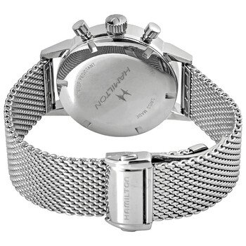 Silver-tone stainless steel case with a silver-tone stainless steel mesh bracelet. Fixed silver-tone stainless steel bezel. Black dial with luminous silver-tone hands and index hour markers. Minute markers. Tachymeter markings around the outer rim. Dial Type: Analog. Luminescent hands and markers. Chronograph - two sub-dials displaying: 60 second and 30 minute. Hand wind movement. Scratch resistant sapphire crystal. Pull / push crown. Solid case back. Round case shape, case size: 40 mm. Band width: 20 mm. Fold over slip through clasp. Water resistant at 100 meters / 330 feet. Functions: chronograph, tachymeter, hour, minute, second. Intra-matic Series. Casual watch style. Hamilton Intra-Matic Chronograph Hand Wind Black Dial Men's Watch H38429130.