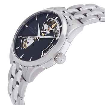 Silver-tone stainless steel case and bracelet. Fixed silver-tone stainless steel bezel. Black dial with silver-tone hands and index hour markers. Minute markers around the outer rim. Dial Type: Analog. Luminescent hands. Hamilton Calibre H-10 Automatic movement, based upon ETA C07.111, containing 25 Jewels, bitting at 21600 vph, and has a power reserve of approximately 80 hours. Scratch resistant sapphire crystal. Pull / push crown. Transparent case back. Round case shape, case size: 36 mm, case thickness: 10 mm. Band width: 18 mm. Butterfly clasp. Water resistant at 50 meters / 165 feet. Functions: hour, minute, second. Jazzmaster Series. Casual watch style. Watch label: Swiss Made. Hamilton Jazzmaster Automatic Black Dial Ladies Watch H32215130.
