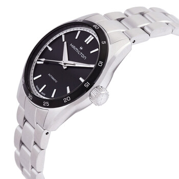 Silver-tone stainless steel case and bracelet. Fixed black stainless steel bezel. Black dial with silver-tone hands and index hour markers. Minute markers around the outer rim. Dial Type: Analog. Hamilton Calibre H-10 Automatic movement, based upon ETA C07.111, containing 25 Jewels, bitting at 21600 vph, and has a power reserve of approximately 80 hours. Scratch resistant sapphire crystal. Screw down crown. Transparent case back. Round case shape, case size: 34 mm. Band width: 18 mm. Butterfly clasp. Water resistant at 100 meters / 330 feet. Functions: hour, minute, second. Jazzmaster Series. Casual watch style. Watch label: Swiss Made. Hamilton Jazzmaster Automatic Black Dial Ladies Watch H36135130.