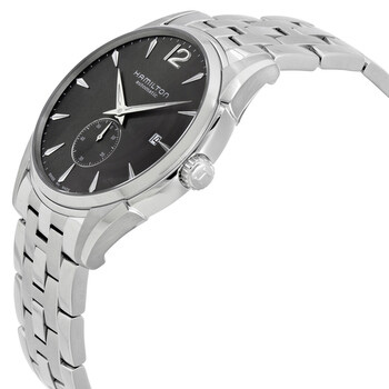 Stainless steel case with a stainless steel bracelet. Fixed stainless steel bezel. Black dial with luminous silver-tone hands and index hour markers. An Arabic numeral marks the 12 o'clock position. Minute markers around the outer rim. Dial Type: Analog. Luminescent hands and markers. Date display at the 3 o'clock position. Seconds sub-dial above the 6 o'clock position. ETA caliber 2895-2 automatic movement with a 42-hour power reserve. Scratch resistant sapphire crystal. Steel crown. Solid case back. Round case shape, case size: 43 mm, case thickness: 10 mm. Band width: 20 mm. Fold over clasp with a push button release. Water resistant at 50 meters / 165 feet. Functions: date, hour, minute, small second. Casual watch style. Watch label: Swiss Made. Hamilton Jazzmaster Swiss Black Dial Men's Watch H38655185.