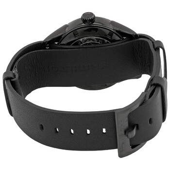 Black PVD stainless steel case with a black leather strap. Fixed black PVD stainless steel bezel. Black dial with gold-tone hands and index hour markers. Minute markers around the outer rim. Dial Type: Analog. Automatic movement. Scratch resistant sapphire crystal. Pull / push crown. Round case shape, case size: 36 mm. Band width: 18 mm. Tang clasp. Water resistant at 50 meters / 165 feet. Functions: hour, minute, second. Jazzmaster Series. Casual watch style. Hamilton Jazzmaster Automatic Black Dial Unisex Watch H32255730.