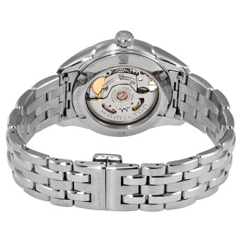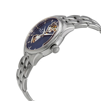Stainless steel case with a stainless steel bracelet. Fixed stainless steel bezel. Blue (cut-out) dial with luminous silver-tone hands and index hour markers. Minute markers around the outer rim. Dial Type: Analog. Luminescent hands. Hamilton calibre H-10 automatic movement, based upon ETA C07.111, containing 25 Jewels, bitting at 21600 vph, and has a power reserve of approximately 80 hours. Scratch resistant sapphire crystal. Pull / push crown. Transparent case back. Round case shape. Case size: 36 mm. Case thickness: 10 mm. Band width: 18 mm. Deployment with push button release clasp. Water resistant at 50 meters / 165 feet. Functions: date, hour, minute, second. Jazzmaster Series. Casual watch style. Watch label: Swiss Made. Hamilton Jazzmaster Automatic Blue Dial Ladies Watch H32215141.