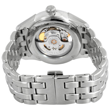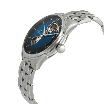 Stainless steel case with a stainless steel bracelet. Fixed stainless steel bezel. Blue dial with luminous silver-tone hands and index hour markers. Minute markers around the outer rim. Dial Type: Analog. Luminescent hands and markers. Hamilton calibre H-10 automatic movement, based upon ETA C07.111, containing 25 Jewels, bitting at 21600 vph, and has a power reserve of approximately 80 hours. Scratch resistant sapphire crystal. Pull / push crown. Transparent case back. Round case shape. Case size: 40 mm. Case thickness: 11.05 mm. Band width: 20 mm. Fold over clasp with a safety release. Water resistant at 50 meters / 165 feet. Functions: date, hour, minute, second. Jazzmaster Series. Casual watch style. Watch label: Swiss Made. Hamilton Jazzmaster Automatic Blue Dial Men's Watch H32675140.