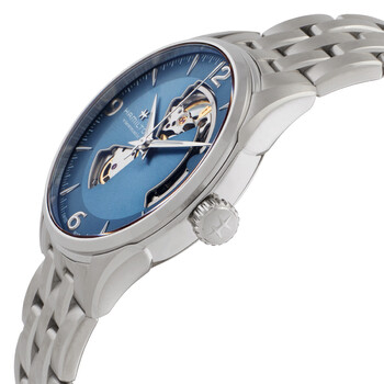 Silver-tone stainless steel case and bracelet. Fixed silver-tone stainless steel bezel. Blue dial with silver-tone hands and index-Arabic numeral hour markers. Arabic numeral marker appears at the 3, 6, 9 and 12 o'clock positions. Minute markers around the outer rim. Dial Type: Analog. Luminescent hands and markers. Hamilton Calibre H-10 Automatic movement, based upon ETA C07.111, containing 25 Jewels, bitting at 21600 vph, and has a power reserve of approximately 80 hours. Scratch resistant sapphire crystal. Pull / push crown. Transparent see through case back. Round case shape, case size: 42 mm, case thickness: 11.44 mm. Band width: 22 mm. Fold over clasp with a safety release. Water resistant at 50 meters / 165 feet. Functions: hour, minute, second. Jazzmaster Series. Sport watch style. Watch label: Swiss Made. Hamilton Jazzmaster Automatic Blue Dial Men's Watch H32705142.