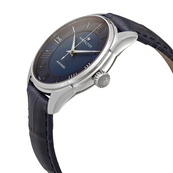Stainless steel case with a blue (calfskin) leather strap. Fixed stainless steel bezel. Blue dial with luminous silver-tone hands and Roman numeral hour markers. Dial Type: Analog. Hamilton calibre H-10 automatic movement, based upon ETA C07.111, containing 25 Jewels, bitting at 21600 vph, and has a power reserve of approximately 80 hours. Scratch resistant sapphire crystal. Transparent case back. Round case shape. Case size: 40 mm. Band width: 20 mm. Tang clasp. Water resistant at 50 meters / 165 feet. Functions: hour, minute, second. Jazzmaster Series. Casual watch style. Watch label: Swiss Made. Hamilton Jazzmaster Automatic Blue Dial Men's Watch H42535640.