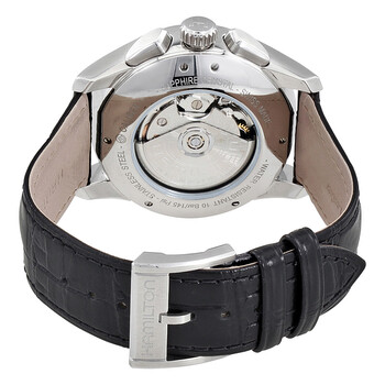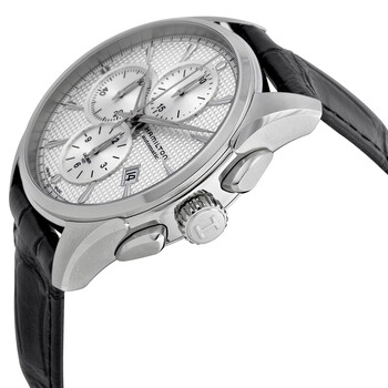 Stainless steel case with a black leather strap. Fixed stainless steel bezel. Silver dial with luminous silver-tone hands and index hour markers. Minute markers around the outer rim. Dial Type: Analog. Luminescent hands and markers. Date display at the 4 o'clock position. Chronograph - three sub-dials displaying: 60 second, 30 minute and 12 hour. Hamilton calibre H-21 automatic movement with a 60-hour power reserve. Scratch resistant sapphire crystal. Pull / push crown. Skeleton case back. Case diameter: 42 mm. Case thickness: 16 mm. Round case shape. Band width: 20 mm. Band length: 7.5 inches. Tang clasp. Water resistant at 100 meters / 330 feet. Functions: chronograph, date, hour, minute, second. Casual watch style. Watch label: Swiss Made. Hamilton Jazzmaster Automatic Chronograph Men's Watch H32596751.