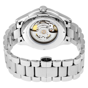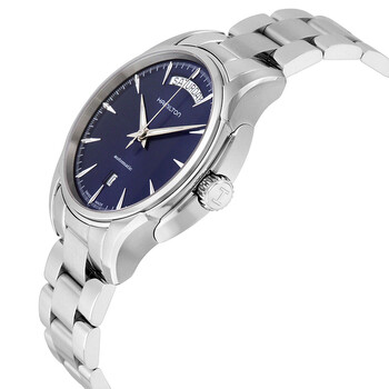 Stainless steel case with a stainless steel bracelet. Fixed stainless steel bezel. Blue dial with silver-tone hands and index hour markers. Minute markers around the outer rim. Dial Type: Analog. Date display at the 6 o'clock position. Day of the week display centered on the 12 o'clock position. Calibre H-40 automatic movement with an 80-hour power reserve. Scratch resistant sapphire crystal. Push / pull crown. Transparent case back. Case size: 40 mm. Case thickness: 11.52 mm. Round case shape. Band width: 20 mm. Fold over clasp with a safety release. Water resistant at 50 meters / 165 feet. Functions: date, day, hour, minute, second. Dress watch style. Watch label: Swiss Made. Hamilton Jazzmaster Automatic Day Date Men's Watch H32505141.