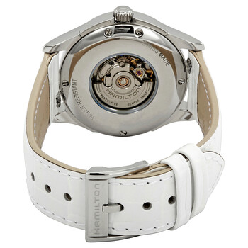 Stainless steel case with a white leather strap. Fixed stainless steel bezel. Silver dial with luminous silver-tone hands and index hour markers. Diamonds mark the 3, 6, 9 and 12 o'clock positions. Minute markers around the outer rim. Dial Type: Analog. Date display above the 6 o'clock position. Caliber 2671 automatic movement with a 38-hour power reserve. Scratch resistant sapphire crystal. Pull / push crown. Transparent case back. Round case shape. Case size: 34 mm. Case thickness: 10.3 mm. Band width: 18 mm. Tang clasp. Water resistant at 50 meters / 165 feet. Functions: date, hour, minute, second. Dress watch style. Watch label: Swiss Made. Hamilton Jazzmaster Automatic Diamond Silver Dial Ladies Watch H32315842.