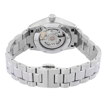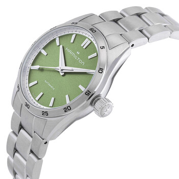 Silver-tone stainless steel case and bracelet. Fixed silver-tone stainless steel bezel. Green dial with silver-tone hands and index hour markers. Minute markers around the outer rim. Dial Type: Analog. Luminescent hands and markers. Hamilton Calibre H-10 Automatic movement, based upon ETA C07.111, containing 25 Jewels, bitting at 21600 vph, and has a power reserve of approximately 80 hours. Scratch resistant sapphire crystal. Screw down crown. Transparent see through case back. Round case shape, case size: 34 mm, case thickness: 11.18 mm. Band width: 18 mm. Butterfly clasp. Water resistant at 100 meters / 330 feet. Functions: hour, minute, second. Jazzmaster Series. Casual watch style. Watch label: Swiss Made. Hamilton Jazzmaster Automatic Green Dial Watch H36105160.