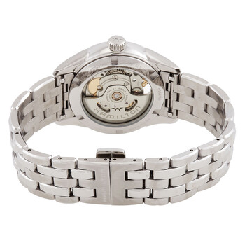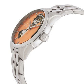 Silver-tone stainless steel case and bracelet. Fixed silver-tone stainless steel bezel. Apricot dial with silver-tone hands and index hour markers. Minute markers around the outer rim. Dial Type: Analog. Hamilton Calibre H-10 Automatic movement, based upon ETA C07.111, containing 25 Jewels, bitting at 21600 vph, and has a power reserve of approximately 80 hours. Scratch resistant sapphire crystal. Pull / push crown. Transparent see through case back. Round case shape, case size: 36 mm, case thickness: 10 mm. Band width: 18 mm. Butterfly clasp. Water resistant at 50 meters / 165 feet. Functions: date, hour, minute, second. Jazzmaster Series. Casual watch style. Watch label: Swiss Made. Hamilton Jazzmaster Automatic Ladies Watch H32215100.