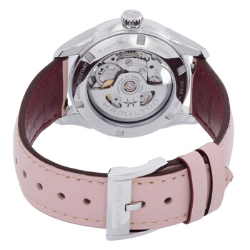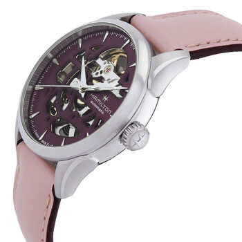 Silver-tone stainless steel case with a pink leather strap. Fixed silver-tone stainless steel bezel. Purple dial with silver-tone hands and index hour markers. Minute markers around the outer rim. Dial Type: Analog. Luminescent hands. Hamilton Calibre H-10-S Automatic movement, based upon ETA C07.111, containing 25 Jewels, bitting at 21600 vph, and has a power reserve of approximately 80 hours. Scratch resistant sapphire crystal. Transparent see through case back. Round case shape, case size: 36 mm, case thickness: 10.55 mm. Band width: 18 mm. Butterfly clasp. Water resistant at 50 meters / 165 feet. Functions: hour, minute, second. Jazzmaster Series. Watch label: Swiss Made. Hamilton Jazzmaster Automatic Purple Dial Ladies Watch H32265801.