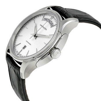 Stainless steel case with a black leather strap. Fixed stainless steel bezel. Silver dial with luminous silver-tone dauphine-style hands and index hour markers. Minute markers around the outer rim. Dial Type: Analog. Luminescent hands and markers. Date display above the 6 o'clock position. Day of the week display centered on the 12 o'clock position. Hamilton calibre H-40 automatic movement, containing 25 Jewels, bitting at 21600 vph, and has a power reserve of approximately 80 hours. Scratch resistant sapphire crystal. Pull / push crown. Transparent case back. Round case shape. Case size: 40 mm. Case thickness: 12 mm. Band width: 20 mm. Tang clasp. Water resistant at 50 meters / 165 feet. Functions: date, day, hour, minute, second. Jazzmaster Series. Dress watch style. Watch label: Swiss Made. Hamilton Jazzmaster Automatic Silver Dial Men's Watch H32505751.