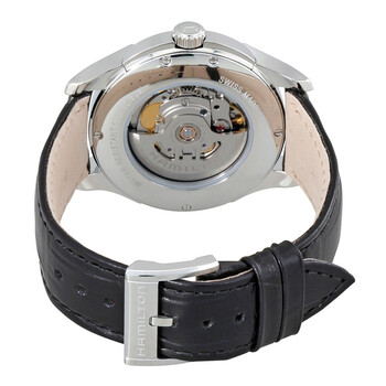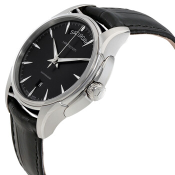 Stainless steel case with a black leather strap. Fixed stainless steel bezel. Black dial with silver-tone hands and index hour markers. Minute markers around the outer rim. Dial Type: Analog. Luminescent hands and markers. Date display at the 6 o'clock position. Day of the week display centered on the 12 o'clock position. Hamilton calibre H-40 automatic movement with an 80-hour power reserve. Scratch resistant sapphire crystal. Pull / push crown. Transparent case back. Case size: 40 mm. Case thickness: 12.5 mm. Round case shape. Band width: 20 mm. Band length: 7.5 inches. Tang clasp. Water resistant at 50 meters / 165 feet. Functions: date, hour, minute, second. Casual watch style. Watch label: Swiss Made. Hamilton Jazzmaster Black Dial Black Leather Men's Watch H32505731.