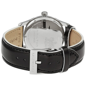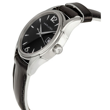 Stainless steel case with a black leather strap. Fixed stainless steel bezel. Black dial with luminous silver-tone hands and index hour markers. Arabic numerals mark the 6 and 12 o'clock positions. Dial Type: Analog. Luminescent hands. Date display at the 3 o'clock position. Quartz movement. Scratch resistant mineral crystal. Screw down crown. Solid case back. Round case shape. Case size: 34 mm. Case thickness: 12 mm. Band width: 18 mm. Band length: 7 inches. Tang clasp. Water resistant at 50 meters / 165 feet. Functions: hours, minutes, seconds, calendar. Casual watch style. Watch label: Swiss Made. Hamilton Jazzmaster Black Dial Ladies Watch H32351735.
