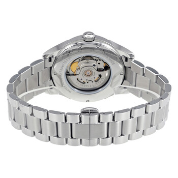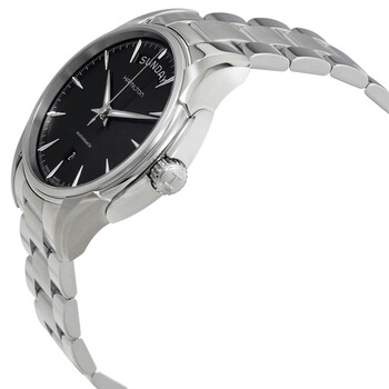 Stainless steel case with a stainless steel bracelet. Fixed stainless steel bezel. Black dial with luminous silver-tone hands and index hour markers. Minute markers around the outer rim. Dial Type: Analog. Luminescent hands and markers. Date display at the 6 o'clock position. Day of the week display at the 12 o'clock position. Calibre H-40 automatic movement with a 80-hour power reserve. Scratch resistant sapphire crystal. Pull / push crown. Skeleton case back. Case size: 40 mm. Case thickness: 9 mm. Round case shape. Band width: 20 mm. Band length: 7 inches. Fold over clasp with a safety release. Water resistant at 50 meters / 165 feet. Functions: date, hour, minute, second. Casual watch style. Watch label: Swiss Made. Hamilton Jazzmaster Black Dial Stainless Steel Men's Watch H32505131. This Hamilton watch from Jazzmaster series features a precise automatic movement encased in stainless steel case 40 mm diameter 9 mm thickness with scratch resistant sapphire crystal. In addional this Hamilton watch features black dial, fixed stainless steel bezel, pull / push crown. This watch rests comfortably on your wrist with its stainless steel bracelet secured by fold over with safety release clasp. Hamilton Jazzmaster Black Dial Stainless Steel Men's Watch H32505131.