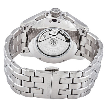 Silver-tone stainless steel case with a silver-tone stainless steel bracelet. Fixed silver-tone stainless steel bezel. Black dial with luminous silver-tone dauphine-style shape hands and index hour markers. Dial Type: Analog. Luminescent hands and markers. Date display at the 4 o'clock position. Chronograph - three sub-dials displaying: 60 second, 30 minute and 12 hours. Hamilton Calibre H-21 Automatic movement, based upon ETA 7750, containing 25 Jewels, bitting at 28800 vph, and has a power reserve of approximately 60 hours. Scratch resistant sapphire crystal. Transparent case back. Round case shape, case size: 42 mm, case thickness: 15.23 mm. Band width: 22 mm. Butterfly clasp. Water resistant at 100 meters / 330 feet. Functions: chronograph, date, hour, minute, second. Jazzmaster Series. Casual watch style. Watch label: Swiss Made. Hamilton Jazzmaster Chronograph Automatic Black Dial Men's Watch H32586181.