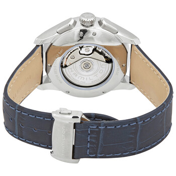 Stainless steel case with a blue (cow) leather strap. Fixed stainless steel bezel. Blue dial with luminous silver-tone dauphine-style shape hands and index hour markers. Minute markers around the outer rim. Dial Type: Analog. Luminescent hands and markers. Date display at the 4 o'clock position. Chronograph - three sub-dials displaying: 60 second, 30 minute and 12 hours. Hamilton calibre H-21 automatic movement, based upon ETA 7750, containing 25 Jewels, bitting at 28800 vph, and has a power reserve of approximately 60 hours. Scratch resistant sapphire crystal. Pull / push crown. Transparent case back. Round case shape. Case size: 42 mm. Case thickness: 15.23 mm. Band width: 22 mm. Deployment clasp. Water resistant at 100 meters / 330 feet. Functions: chronograph, date, hour, minute, second. Jazzmaster Series. Sport watch style. Watch label: Swiss Made. Hamilton Jazzmaster Chronograph Automatic Blue Dial Men's Watch H32586641.