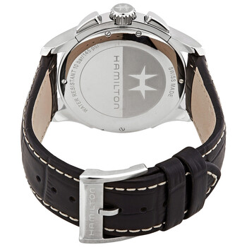 Stainless steel case with a black leather strap. Fixed stainless steel bezel. Black dial with luminous silver-tone hands and index hour markers. An Arabic numeral appears at the 12 o'clock position. Minute markers around the outer rim. Dial Type: Analog. Luminescent hands and markers. Date display at the 4 o'clock position. Chronograph - three sub-dials displaying: 60 second, 30 minute and 1/10th of a cecond. Quartz movement. Scratch resistant sapphire crystal. Pull / push crown. Solid case back. Round case shape. Case size: 42 mm. Case thickness: 12.13 mm. Band width: 22 mm. Tang clasp. Water resistant at 100 meters / 330 feet. Functions: chronograph, date, hour, minute, second. Casual watch style. Watch label: Swiss Made. Hamilton Jazzmaster Chronograph Quartz Black Dial Men's Watch H32612731.