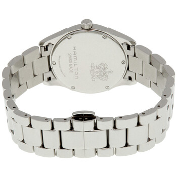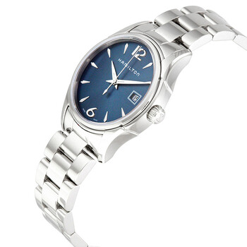 Stainless steel case with a stainless steel bracelet. Fixed stainless steel bezel. Blue dial with silver-tone dauphine-style shape hands and index hour markers. Arabic numerals mark the 6 and 12 o'clock positions. Dial Type: Analog. Date display at the 3 o'clock position. ETA caliber F05.111 quartz movement. Scratch resistant sapphire crystal. Pull / push crown. Solid case back. Round case shape. Case size: 33 mm. Case thickness: 9 mm. Band width: 18 mm. Deployment clasp. Water resistant at 50 meters / 165 feet. Functions: date, hour, minute, second. Casual watch style. Watch label: Swiss Made. Hamilton Jazzmaster Lady Blue Dial Ladies Watch H32351145.