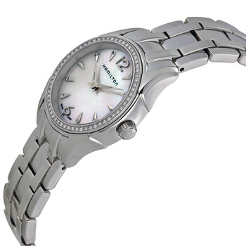 Stainless steel case with a stainless steel bracelet. Fixed stainless steel bezel set with diamonds. Mother of pearl dial with luminous silver-tone hands and diamond-tipped index hour markers. Arabic numerals mark the 6 and 12 o'clock positions. Dial Type: Analog. Luminescent hands. ETA caliber 901.001 quartz movement. Scratch resistant sapphire crystal. Pull / push crown. Solid case back. Round case shape. Case size: 27 mm. Case thickness: 7 mm. Band width: 20 mm. Fold over clasp with a push button release. Water resistant at 50 meters / 165 feet. Functions: hour, minute. Dress watch style. Watch label: Swiss Made. Hamilton Jazzmaster Lady Mother of Pearl Dial Watch H32281197.