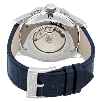 Stainless steel case with a blue leather strap. Fixed stainless steel bezel. Blue dial with luminous silver-tone hands and Arabic numeral hour markers. Arabic numeral minute markers (at 5 minute intervals). Minute markers around the outer rim. Dial Type: Analog. Luminescent hands and markers. Day of the week and date display at the 3 o'clock position. Two white sub-dials displaying: 30 minute and 12 hour. Hamilton calibre H-21 automatic movement, based upon ETA 7750, containing 25 Jewels, bitting at 28800 vph, and has a power reserve of approximately 60 hours. Scratch resistant sapphire crystal. Pull / push crown. Transparent case back. Round case shape. Case size: 45 mm. Case thickness: 15.35 mm. Band width: 23 mm. Tang clasp. Water resistant at 100 meters / 330 feet. Functions: date, day, hour, minute, second. Jazzmaster Maestro Series. Dress watch style. Watch label: Swiss Made. Hamilton Jazzmaster Maestro Automatic Blue Dial Men's Watch H32766643.