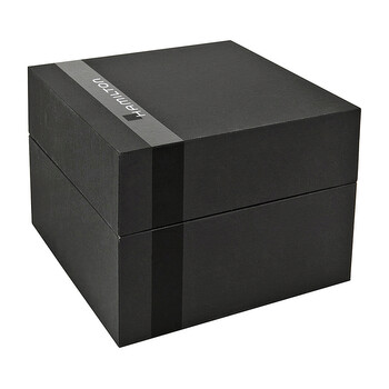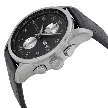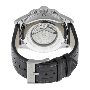 Stainless steel case with a black leather strap. Fixed stainless steel bezel. Black dial with silver-tone hands and Arabic numeral hour markers. Minute markers around the outer rim. Dial Type: Analog. Luminescent hands and markers. Day of the week and date display at the 3 position. Chronograph - two sub-dials displaying: 30 minutes and 12 hours. Automatic movement. Scratch resistant sapphire crystal. Skeleton case back. Case diameter: 45 mm. Round case shape. Band width: 23 mm. Deployment clasp with push button release. Water resistant at 100 meters / 330 feet. Functions: chronograph, date, hour, minute, second. Casual watch style. Hamilton Jazzmaster Maestro Chronograph Men Watch H32766783.