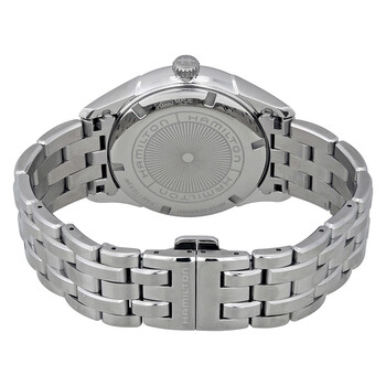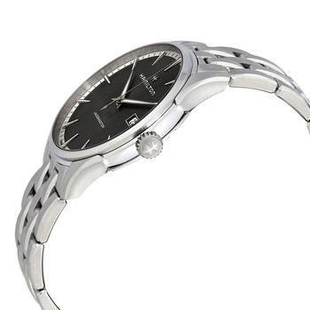 Stainless steel case with a stainless steel bracelet. Fixed stainless steel bezel. Black dial with luminous silver-tone hands and index hour markers. Minute markers around the outer rim. Dial Type: Analog. Luminescent hands and markers. Date display at the 3 o'clock position. ETA caliber F06.111 quartz movement. Scratch resistant sapphire crystal. Pull / push crown. Solid case back. Round case shape. Case size: 40 mm. Case thickness: 10,2 mm. Band width: 20 mm. Fold over clasp with a push button release. Water resistant at 50 meters / 165 feet. Functions: date, hour, minute, second. Casual watch style. Watch label: Swiss Made. Hamilton Jazzmaster Men's Watch H32451181.