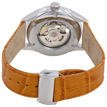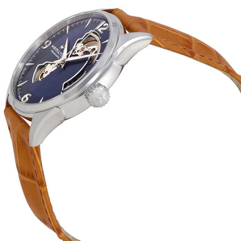 Silver-tone stainless steel case with a brown leather strap. Fixed silver-tone stainless steel bezel. Blue (open heart) dial with luminous silver-tone dauphine-style hands and index hour markers. Arabic numerals mark the 3, 6, 9 and 12 o'clock positions. Minute markers around the outer rim. Dial Type: Analog. Luminescent hands and markers. Hamilton calibre H-10 automatic movement, based upon ETA C07.111, containing 25 Jewels, bitting at 21600 vph, and has a power reserve of approximately 80 hours. Scratch resistant sapphire crystal. Transparent case back. Round case shape. Case size: 42 mm. Case thickness: 11.4 mm. Band width: 22 mm. Deployment clasp. Water resistant at 50 meters / 165 feet. Functions: hour, minute, second. Casual watch style. Watch label: Swiss Made. Hamilton Jazzmaster Open Heart Automatic Men's Leather Watch H32705541.
