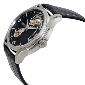Stainless steel case with a black leather strap. Fixed stainless steel bezel. Black (skeletal cut-out) dial with silver-tone dauphine-style hands and index hour markers. Arabic numerals mark the 3, 6, 9 and 12 o'clock positions. Minute markers around the outer rim. Dial Type: Analog. Luminescent hands and markers. ETA caliber 2824-2 automatic movement, based upon ETA 2824, containing 25 Jewels, bitting at 28800 vph, and has a power reserve of approximately 38 hours. Scratch resistant sapphire crystal. Pull / push crown. Skeleton case back. Round case shape. Case size: 40 mm. Case thickness: 11 mm. Band width: 20 mm. Tang clasp. Water resistant at 50 meters / 165 feet. Functions: hours, minutes, seconds. Dress watch style. Watch label: Swiss Made. Hamilton Jazzmaster Open Heart Automatic Men's Watch H32565735.