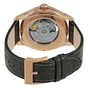 Rose gold-plated stainless steel case with a black leather strap. Fixed rose gold-plated stainless steel bezel. Black (open heart) dial with luminous rose gold-tone dauphine-style hands and index hour markers. Arabic numerals mark the 3, 6, 9 and 12 o'clock positions. Minute markers around the outer rim. Dial Type: Analog. Luminescent hands. ETA Caliber 2824-2 Automatic movement, based upon ETA 2824, containing 25 Jewels, bitting at 28800 vph, and has a power reserve of approximately 38 hours. Scratch resistant sapphire crystal. Pull / push crown. Skeleton case back. Round case shape, case size: 40 mm, case thickness: 11 mm. Band width: 20 mm. Tang clasp. Water resistant at 50 meters / 165 feet. Functions: hours, minutes. Jazzmaster Series. Dress watch style. Watch label: Swiss Made. Hamilton Jazzmaster Open Heart Automatic Men's Watch H32575735.