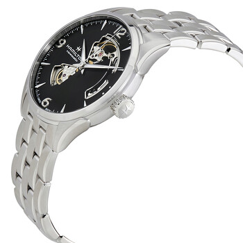 Stainless steel case with a stainless steel bracelet. Fixed stainless steel bezel. Black (open heart) dial with luminous silver-tone dauphine-style hands and index hour markers. Arabic numerals mark the 3, 6, 9 and 12 o'clock positions. Minute markers around the outer rim. Dial Type: Analog. Luminescent hands and markers. Hamilton calibre H-10 automatic movement, based upon ETA C07.111, containing 25 Jewels, bitting at 21600 vph, and has a power reserve of approximately 80 hours. Scratch resistant sapphire crystal. Transparent case back. Round case shape. Case size: 42 mm. Case thickness: 12 mm. Band width: 22 mm. Deployment clasp. Water resistant at 50 meters / 165 feet. Functions: hour, minute, second. Additional Info: suitable for use around household sinks playing sports and swimming in shallow water but not bathing snorkeling or scuba diving. Jazzmaster Open Heart Series. Dress watch style. Watch label: Swiss Made. Hamilton Jazzmaster Open Heart Automatic Men's Watch H32705131.