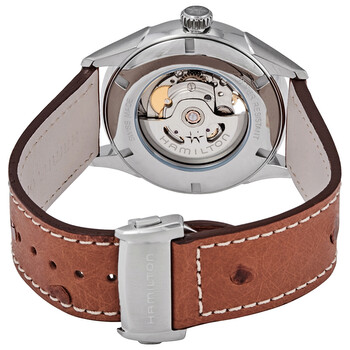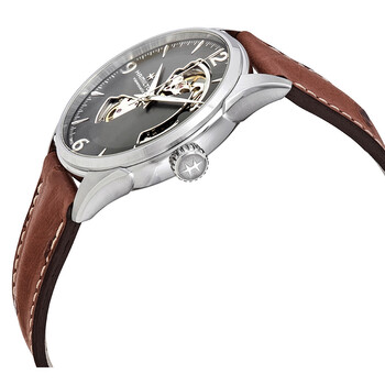 Stainless steel case with a brown leather strap. Fixed stainless steel bezel. Grey (open heart) dial with luminous silver-tone dauphine-style hands and index hour markers. Arabic numerals mark the 3, 6, 9 and 12 o'clock positions. Minute markers around the outer rim. Dial Type: Analog. Luminescent hands and markers. Hamilton calibre H-10 automatic movement, based upon ETA C07.111, containing 25 Jewels, bitting at 21600 vph, and has a power reserve of approximately 80 hours. Scratch resistant sapphire crystal. Screw down crown. Transparent case back. Round case shape. Case size: 42 mm. Case thickness: 11.4 mm. Band width: 22 mm. Fold over clasp. Water resistant at 50 meters / 165 feet. Functions: hour, minute, second. Dress watch style. Watch label: Swiss Made. Hamilton Jazzmaster Open Heart Automatic Men's Watch H32705581.