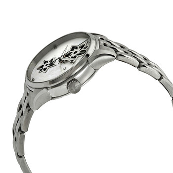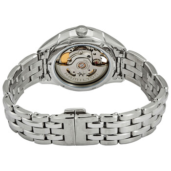 Stainless steel case with a stainless steel bracelet. Fixed stainless steel bezel. White mother of pearl (open heart) dial with luminous silver-tone dauphine-style hands. Diamonds mark the 3, 6, 9 and 12 o'clock positions. Dial Type: Analog. Luminescent hands. Hamilton calibre H-10 automatic movement, based upon ETA C07.111, containing 25 Jewels, bitting at 21600 vph, and has a power reserve of approximately 80 hours. Scratch resistant sapphire crystal. Pull / push crown. Transparent case back. Round case shape. Case size: 34 mm. Case thickness: 10.64 mm. Band width: 16 mm. Hidden fold over clasp. Water resistant at 50 meters / 165 feet. Functions: hour, minute, second. Casual watch style. Watch label: Swiss Made. Hamilton Jazzmaster Open Heart Automatic MOP Diamond Dial Ladies Watch H32115192.