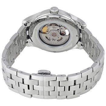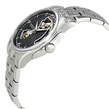 Stainless steel case with a stainless steel bracelet. Fixed stainless steel bezel. Grey (open heart display) dial with luminous silver-tone dauphine-style hands and index hour markers. Arabic numerals mark the 3, 6, 9 and 12 o'clock positions. Minute markers around the outer rim. Dial Type: Analog. Luminescent hands. Hamilton calibre H-10 automatic movement, based upon ETA C07.111, containing 25 Jewels, bitting at 21600 vph, and has a power reserve of approximately 80 hours. Scratch resistant sapphire crystal. Transparent case back. Round case shape. Case size: 40 mm. Case thickness: 11 mm. Band width: 20 mm. Fold over clasp with a safety release. Water resistant at 50 meters / 165 feet. Functions: hour, minute, second. Jazzmaster Series. Dress watch style. Watch label: Swiss Made. Hamilton Jazzmaster Open Heart Grey Dial Men's Watch H32565185.