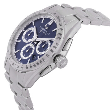 Silver-tone stainless steel case and bracelet. Fixed silver-tone stainless steel bezel. Blue dial with silver-tone hands and index hour markers. Tachymeter scale around the outer rim. Dial Type: Analog. Date display between 4 and 5 o'clock position. Chronograph - two sub-dials displaying: 30 minute and 60 second. Hamilton Calibre H-31 Automatic movement, based upon ETA 7753, containing 27 Jewels, bitting at 28800 vph, and has a power reserve of approximately 60 hours. Scratch resistant sapphire crystal. Screw down crown. Transparent see through case back. Round case shape, case size: 42 mm, case thickness: 15.22 mm. Band width: 22 mm. Butterfly clasp. Water resistant at 100 meters / 330 feet. Functions: chronograph, date, hour, minute, second. Jazzmaster Series. Sport watch style. Watch label: Swiss Made. Hamilton Jazzmaster Performer Autochrono Blue Dial Watch H36616140.