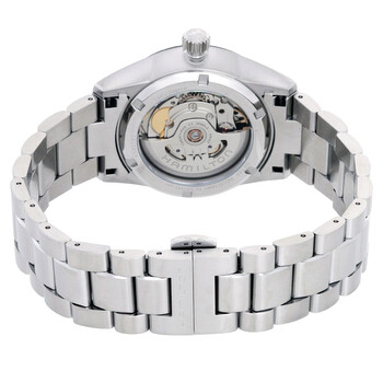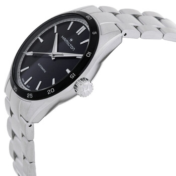 Silver-tone stainless steel case and bracelet. Fixed black stainless steel bezel. Black dial with silver-tone hands and index hour markers. Minute markers around the outer rim. Dial Type: Analog. Luminescent hands and markers. Hamilton Calibre H-10 Automatic movement, based upon ETA C07.111, containing 25 Jewels, bitting at 21600 vph, and has a power reserve of approximately 80 hours. Scratch resistant sapphire crystal. Round case shape, case size: 38 mm. Fold over clasp with a safety release. Water resistant at 100 meters / 330 feet. Functions: hour, minute, second. Jazzmaster Performer Series. Casual watch style. Watch label: Swiss Made. Hamilton Jazzmaster Performer Automatic Black Dial Unisex Watch H36205130.