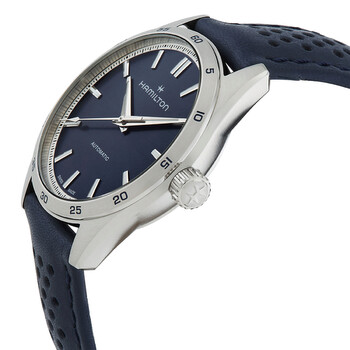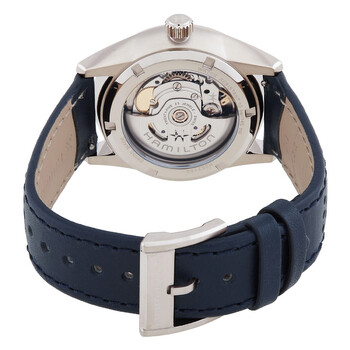 Silver-tone stainless steel case with a blue leather strap. Fixed silver-tone stainless steel bezel. Blue dial with silver-tone hands and index hour markers. Minute markers around the outer rim. Dial Type: Analog. Luminescent hands and markers. Hamilton Calibre H-10 Automatic movement, based upon ETA C07.111, containing 25 Jewels, bitting at 21600 vph, and has a power reserve of approximately 80 hours. Scratch resistant sapphire crystal. Screw down crown. Transparent case back. Round case shape, case size: 38 mm, case thickness: 11.47 mm. Band width: 20 mm. Buckle clasp. Water resistant at 100 meters / 330 feet. Functions: hour, minute, second. Jazzmaster Series. Casual watch style. Watch label: Swiss Made. Hamilton Jazzmaster Performer Automatic Blue Dial Men's Watch H36215640.