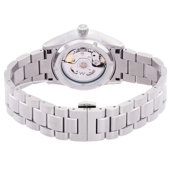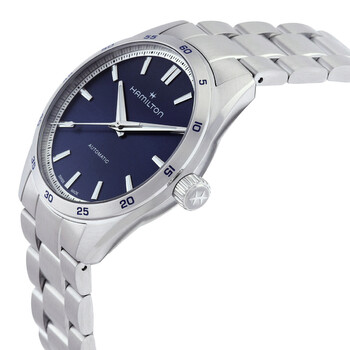 Silver-tone stainless steel case and bracelet. Fixed silver-tone stainless steel bezel. Blue dial with silver-tone hands and index hour markers. Minute markers around the outer rim. Dial Type: Analog. Luminescent hands and markers. Hamilton Calibre H-10 Automatic movement, based upon ETA C07.111, containing 25 Jewels, bitting at 21600 vph, and has a power reserve of approximately 80 hours. Scratch resistant sapphire crystal. Screw down crown. Transparent see through case back. Round case shape, case size: 38 mm, case thickness: 11.47 mm. Band width: 20 mm. Butterfly clasp. Water resistant at 100 meters / 330 feet. Functions: date, hour, minute, second. Jazzmaster Series. Casual watch style. Watch label: Swiss Made. Hamilton Jazzmaster Performer Automatic Blue Dial Watch H36215140.