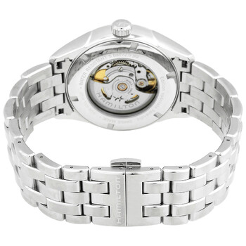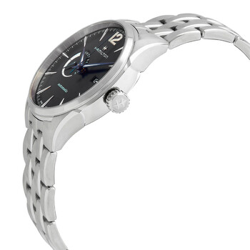 Silver-tone stainless steel case and bracelet. Fixed stainless steel bezel. Black dial with blue hands and index-Arabic at the 12 o' clock hour markers. Dial Type: Analog. Date display at the 3 o'clock position. One-power reserve subdials. Hamilton Calibre H-13 automatic movement with an 80-hour power reserve. Scratch resistant sapphire crystal. Round case shape, case size: 42 mm. Band width: 22 mm. Butterfly clasp. Water resistant at 50 meters / 165 feet. Functions: date, hour, minute, second, power reserve. Jazzmaster Power Reserve Series. Dress watch style. Watch label: Swiss Made. Hamilton Jazzmaster Power Reserve Automatic Black Dial Men's Watch H89545131.