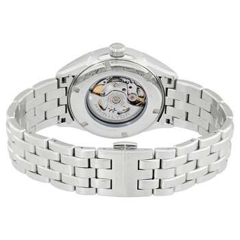Stainless steel case with a stainless steel bracelet. Fixed stainless steel bezel. Black dial with luminous silver-tone hands and index hour markers. Minute markers around the outer rim. Dial Type: Analog. Luminescent hands. Date display at the 3 o'clock position. Power reserve indicator subdials. Hamilton calibre H-13 automatic movement with an 80-hour power reserve. Scratch resistant sapphire crystal. Pull / push crown. Transparent case back. Round case shape. Case size: 42 mm. Case thickness: 12.64 mm. Band width: 22 mm. Fold over clasp. Water resistant at 50 meters / 165 feet. Functions: date, hour, minute, second, power reserve indicator. Casual watch style. Watch label: Swiss Made. Hamilton Jazzmaster Power Reserve Automatic Men's Watch H32635131.