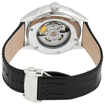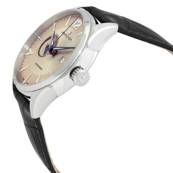 Silver-tone stainless steel case with a black calf leather strap. Fixed silver-tone stainless steel bezel. Beige dial with blue hands and index-Arabic at the 12 o' clock hour markers. Dial Type: Analog. Date display at the 3 o'clock position. One-power reserve subdials. Hamilton Calibre H-13 automatic movement with an 80-hour power reserve. Scratch resistant sapphire crystal. Round case shape, case size: 42 mm. Folding clasp. Water resistant at 50 meters / 165 feet. Functions: date, hour, minute, second, power reserve. Jazzmaster Power Reserve Series. Dress watch style. Watch label: Swiss Made. Hamilton Jazzmaster Power Reserve Automatic Men's Watch H89545721.