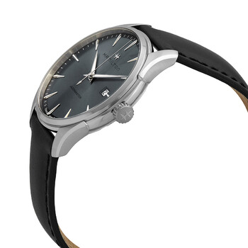 Stainless steel case with a black leather strap. Fixed stainless steel bezel. Grey dial with luminous silver-tone hands and index hour markers. Minute markers around the outer rim. Dial Type: Analog. Luminescent hands and markers. Date display at the 3 o'clock position. ETA caliber F06.111 quartz movement. Scratch resistant sapphire crystal. Pull / push crown. Solid case back. Round case shape. Case size: 40 mm. Case thickness: 10.2 mm. Band width: 20 mm. Tang clasp. Water resistant at 50 meters / 165 feet. Functions: date, hour, minute, second. Jazzmaster Series. Casual watch style. Watch label: Swiss Made. Hamilton Jazzmaster Quartz Grey Dial Black Leather Men's Watch H32451742.