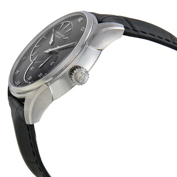 Stainless steel case with a black leather strap. Fixed stainless steel bezel. Blue dial with silver-tone minute hand. Separate hours and seconds sub-dials. Dial Type: Analog. Hamilton calibre H-12 automatic movement, based upon ETA 2825-2, containing 25 Jewels, bitting at 28800 vph, and has a power reserve of approximately 42 hours. Scratch resistant sapphire crystal. Pull / push crown. Exhibition case back. Round case shape. Case size: 42 mm. Case thickness: 13 mm. Band width: 22 mm. Band length: 7.5 inches. Deployment clasp. Water resistant at 50 meters / 165 feet. Functions: hour, minute, second. Jazzmaster Series. Dress watch style. Watch label: Swiss Made. Hamilton Jazzmaster Regulator Automatic Blue Dial Men's Watch H42615743.