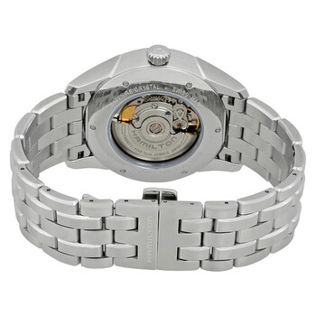 Stainless steel case with a stainless steel bracelet. Fixed Stainless steel bezel. Silver dial with rose gold-tone hands and index hour markers. Arabic numeral minute markers (at 5 minute intervals). Minute markers around the outer rim. Dial Type: Analog. Two sub-dials displaying: small 12 hours and small seconds. Hamilton calibre H-12 automatic movement, based upon ETA 2825-2, containing 25 Jewels, bitting at 28800 vph, and has a power reserve of approximately 42 hours. Scratch resistant sapphire crystal. Pull / push crown. Transparent case back. Round case shape. Case size: 42 mm. Case thickness: 13.13 mm. Band width: 22 mm. Fold over clasp with a push button release. Water resistant at 50 meters / 165 feet. Functions: hour, minute, second. Jazzmaster Regulator Series. Dress watch style. Watch label: Swiss Made. Hamilton Jazzmaster Regulator Automatic Silver Dial Men's Watch H42615151.