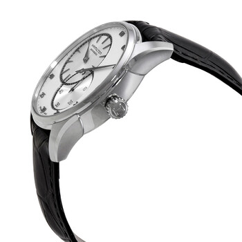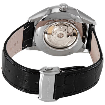 Stainless steel case with a black leather strap. Fixed stainless steel bezel. White dial with black hour hand and index hour markers. Arabic numeral minute markers (at 5 minute intervals). Minute markers around the outer rim. Dial Type: Analog. Seconds sub-dial. Hamilton calibre H-12 automatic movement, based upon ETA 2825-2, containing 25 Jewels, bitting at 28800 vph, and has a power reserve of approximately 42 hours. Scratch resistant sapphire crystal. Pull / push crown. Transparent case back. Round case shape. Case size: 42 mm. Case thickness: 13 mm. Band width: 22 mm / 20 mm. Fold over clasp. Water resistant at 50 meters / 165 feet. Functions: hour, minute, second. Jazzmaster Regulator Series. Dress watch style. Watch label: Swiss Made. Hamilton Jazzmaster Regulator Automatic White Dial Men's Watch H42615753.