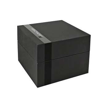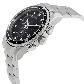 Stainless steel case with a stainless steel bracelet. Uni-directional rotating coin edge stainless steel bezel with a black ion-plated (count-up elapsed time) ring. Black dial with luminous silver-tone hands and index hour markers. Minute markers around the outer rim. Dial Type: Analog. Luminescent hands and markers. Date display at the 4 o'clock position. Chronograph - three sub-dials displaying: 60 second, 30 minute and 1/10th of a second. ETA caliber 251.274 quartz movement. Scratch resistant sapphire crystal. Pull / push crown. Solid case back. Round case shape. Case size: 44 mm. Case thickness: 13 mm. Band width: 22 mm. Band length: 7 inches. Deployment clasp with a push button release. Water resistant at 100 meters / 330 feet. Functions: hours, minutes, seconds, calendar, chronograph. Jazzmaster Seaview Series. Sport watch style. Watch label: Swiss Made. Hamilton Jazzmaster Seaview Chronograph Men's Watch H37512131.